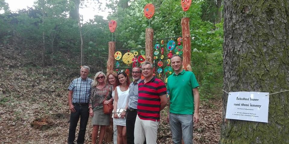 In diesem Schuljahr stand neben einem fünftägigen Austauschprogramm die kreative Fertigung einer Skulptur für den „Zauberwald“ am Kammerbühlgelände an. Nach einer gemeinsamen Planungs- und Begegnungsphase an beiden Schulen entwickelten die Schüler das Objekt aus Erlenholzstämmen, Metallstäben und Reliefteilchen aus Ton im Mai und Juni innerhalb des Kunstunterrichts unter der Leitung von Fachoberlehrerin Helga Küchler und Lucie Pixová. Mit gemeinsamen Kräften und technischer Unterstützung vor Ort fand das gut 2,80 m hohe und farbenfrohe Kunstwerk kurz vor der feierlichen Eröffnung seinen Platz wirkungsvoll direkt in einer kleinen Talsenke.