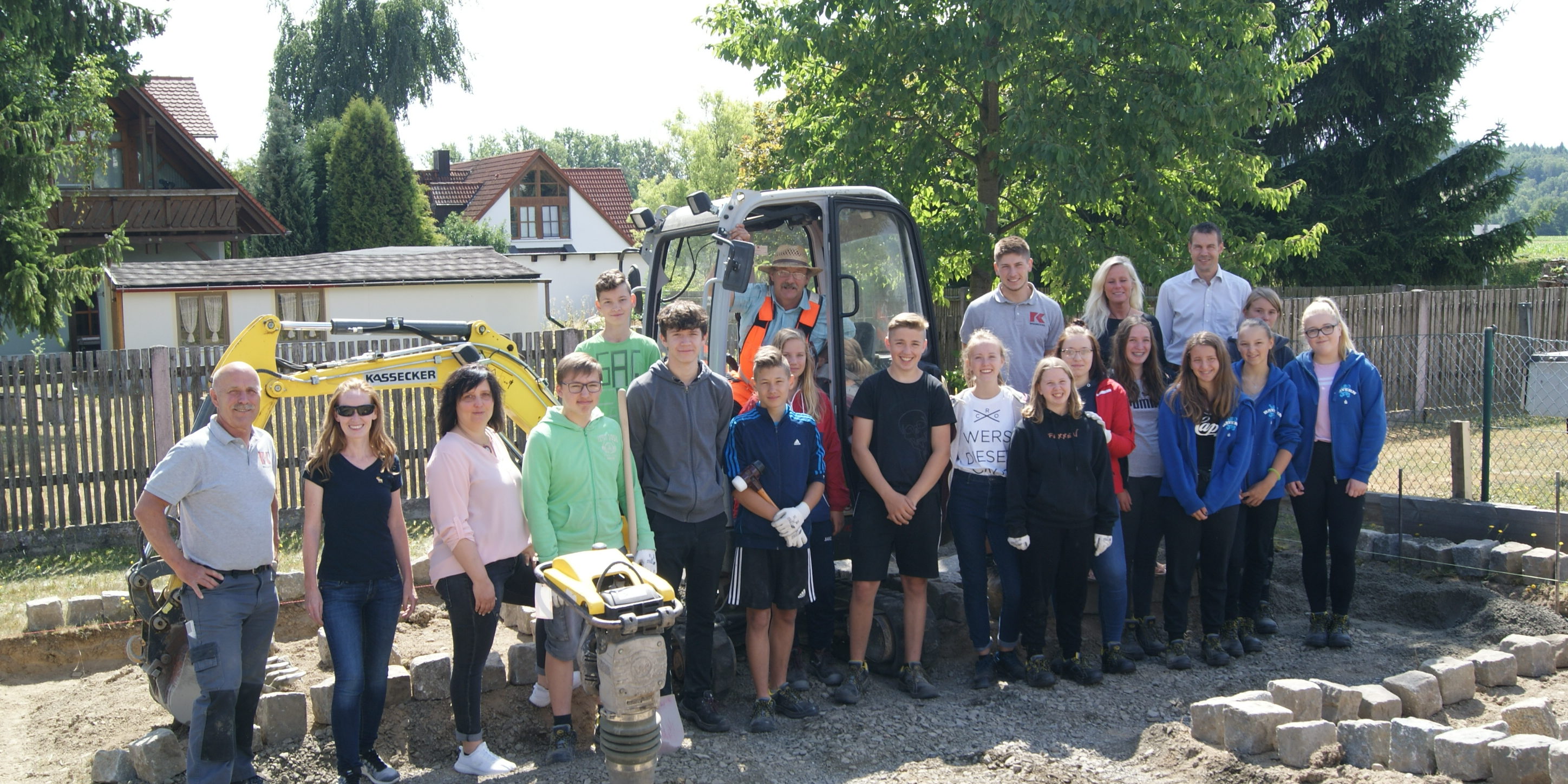 Auf dem Weg zu einem ökologischen Schulgarten durfte die Waldsassener Mittelschule erst kürzlich auf tat- und fachkräftige Unterstützung der Firma Kassecker vertrauen. Nach dem Motto „Hilfe zur Selbsthilfe“ leitete ein dreiköpfiges Team des Bauunternehmens die Schülerinnen und Schüler der Ganztagsklasse 8M an. In drei Tagen Projektlaufzeit entstand so aus einer bis dato ungenutzten Wiesenfläche eine neue, ökologische Beetanlage. „Für uns hat das Praxisprojekt gleich mehrfachen Nutzen“, freut sich Rektorin Claudia Strobel-Dietrich über das Zustandekommen und die reibungslose Abwicklung mit der Kassecker Gruppe. „Zum einen genießen unsere Schülerinnen und Schüler die Abwechslung vom Schulalltag und erhalten wertvolle Eindrücke zur Berufsorientierung, zum anderen profitiert unser Schulgarten von einem professionell angelegten Beet“, so Strobel-Dietrich weiter. Im Rahmen des Schulauftrages innerhalb des Prädikates „Gute gesunde Schule“ kann die Ernte außerdem durch die Hauswirtschaftsschüler weiterverarbeitet werden und in die Schulverpflegung einfließen. „Ein toller Kreislauf, ganz nach dem Vorbild unserer Natur“, ergänzt Lehrerin Sandy Wendt. Die Umsetzung des in vier Segmente unterteilten Beets erstreckte sich auf insgesamt 3 Projekttage. Beim Ausstecken eines rechten Winkels konnten die Schüler unter anderem ihre Mathekenntnisse (Satz des Pythagoras) unter Beweis stellen. Beim anschließenden Erdaushub für die Beetflächen und -einfassungen waren hingegen Geschick am Bagger oder pure Muskelkraft beim Schaufeln gefragt. Mit Granitpflastern erstellten die Achtklässler letztlich die Einfassung der Anlage sowie der vier darin liegenden Pflanzflächen mit Zuwegung. Bevor es losging, erhielten alle Schüler noch fachgerechte Ausrüstung in Form von Sicherheitsschuhen, die das bfz Weiden kostenfrei beisteuerte. Am Ende der drei Tage standen ein fertiges Bauprojekt sowie jede Menge gemeinsame, praktische Lernerfahrungen der Schüler. Und Kassecker: Als attraktiver, potentieller Arbeitgeber der Region.