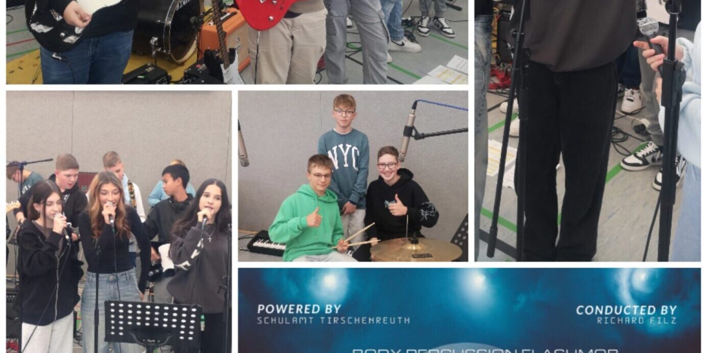 Am Dienstag, 22.10.2024 machten sich 15 Schüler aus den Klassen 8M und 9 GTK als „Schulband der Mittelschule Waldsassen“ auf den Weg zum Body-Percussion-Event „TIR-BEAT 2024“ nach Kemnath in die Mehrzweckhalle. Zusammen mit ihren Musiklehrern Herrn Bauer und Herrn Staufer durften die Schüler nicht nur dem Body-Percussion-Virtuosen Richard Filz aus Österreich lauschen, sondern auch vor über 650 Schülern aus verschiedenen Grund- und Mittelschulen aus dem Landkreis „performen“! Als erfahrene Bandklassenschüler – erwachsen aus dem Projekt „Klasse-im-Puls“ – konnten die Schüler den Zuhörern mit den Titeln „Summer of 69“ von Bryan Adams, „Really don’t care“ von Demi Lovato und „Zombie“ von den Cranberries so richtig einheizen. Nachdem der Profi Richard Filz die Schüler zu einer Zugabe aufgefordert hatte, brachten Sie zusammen mit ihm die Mehrzweckhalle mit einer Impro-Body-Percussion-Einlage von „Zombie“ so richtig zum Beben.