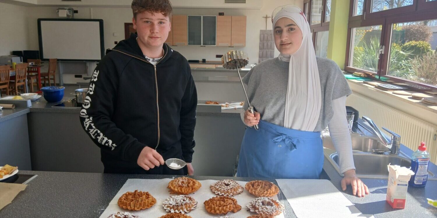 Schülerinnen und Schüler der Klasse VK 10 b bereiteten gemeinsam mit Frau Zölch die alte, landestypische fränkische Spezialität „Rosenküchlein“ zu. Anschließend wurden die noch warmen Küchlein an die Schulfamilie zum Verkosten verteilt. Die Testesserinnen und Testesser waren von der leckeren Süßspeise restlos begeistert. Essen verbindet Kulturen!