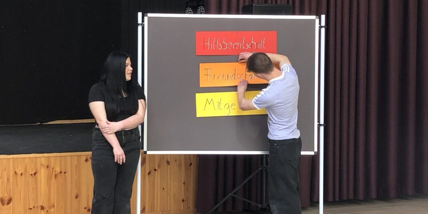Zusammen mit unserer Wertebotschafterin Layla Negelein haben die Schülerinnen und Schüler der Klasse 5 GTK eine Pantomime unserer AG Theater zum Thema Ausgrenzung analysiert. Dabei wurden zusammen Handlungsalternativen erarbeitet, die Szenen wie Mobbing und Ausgrenzung gar nicht erst entstehen lassen oder unterbrechen und auflösen können. Das Publikum erarbeitete wo und bei wem man sich in der Schule Hilfe holen kann, was der Wert Freundschaft bedeutet und wie wichtig die Werte Mitgefühl und Hilfsbereitschaft für die Gemeinschaft, aber auch den Einzelnen sind.