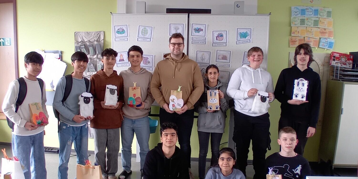 Mit der Anleitung von Herrn Strenge bastelten die Schüler eifrig ihre eigenen, selbst gestalteten Ostertüten. Es entstanden originelle, mit Schafen, Hasen und mit Ostereiern verzierte Ostertüten. Als besondere Überraschung wurden die Tüten dann über Nacht vom Schulosterhasen befüllt – natürlich seeeeehr zur Freude unserer Schülerinnen und Schüler aus der Deutschklasse!
