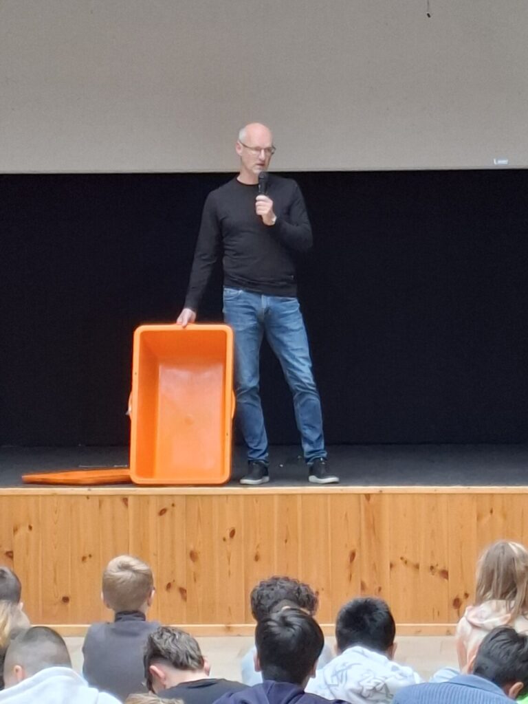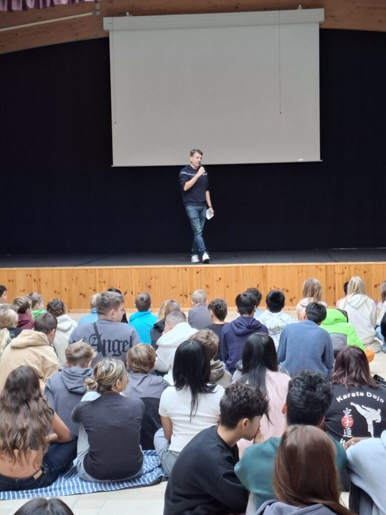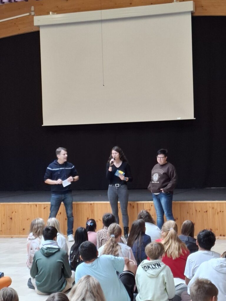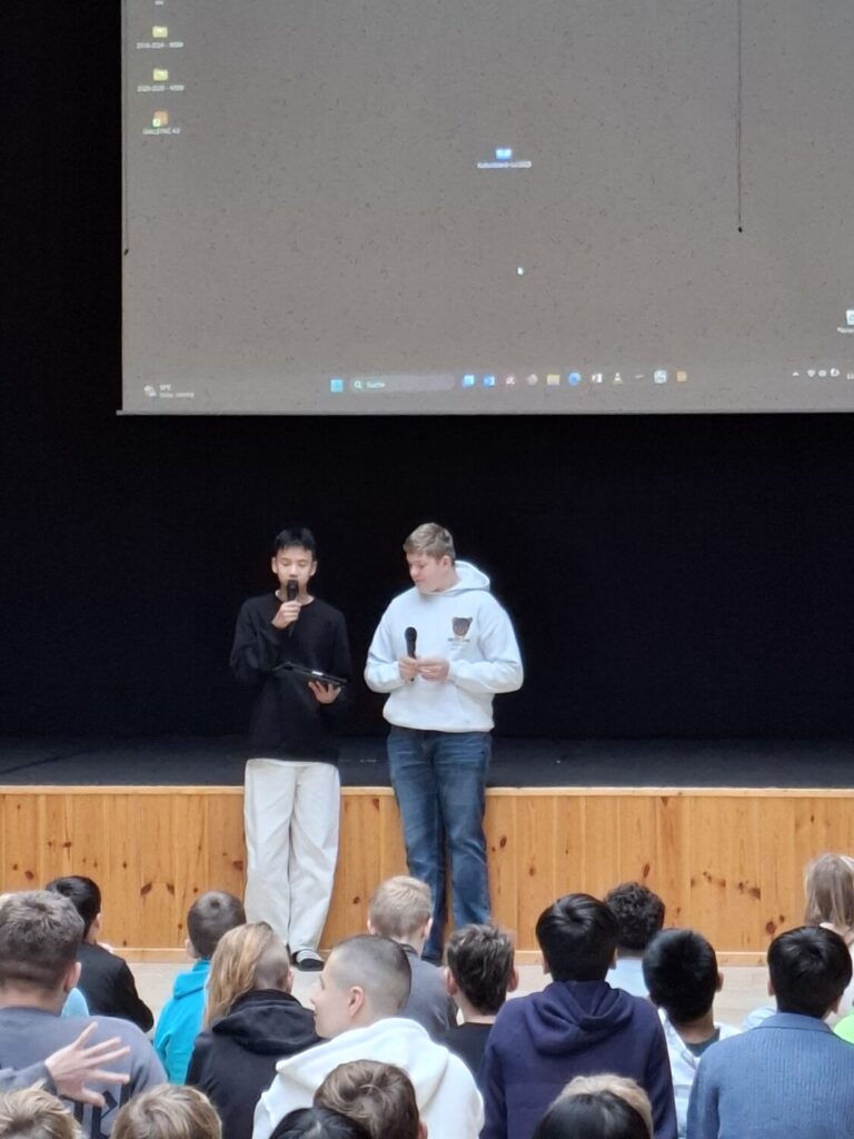 Mit der Vorstellung unserer neuen Schulsekretärin, Frau Melanie Gmeiner, starteten die allmonatlichen Schulassemblys des Schuljahres 2025/26. In einer kurzen Vorstellungsrunde erklärte Frau Gmeiner unter anderem, dass sie selbst auch viele Jahre Schülerin an der Mittelschule Waldsassen war. Im Anschluss stellten Frau Langgut und Frau Schlicht die attraktiven Angebote des Waldsassener Jugendtreffs im alten Bahnhof vor. Anhand eines eindrucksvollen Videos präsentierten die Kulturlotsen aus der Klasse 9 M ihre Aufgabenbereiche und erklärten nochmals den Begriff „Kulturschule“. Anlässlich der bayernweiten Gesundheitswoche an Schulen zeigte Herr Mickisch der Schulgemeinschaft die im Rahem des Programms „Fit4Teens“ angeschafften Materialien für die bewegte Pause und berichtete abschließend vom Schulsanitäsdienst, der in diesem Schuljahr von neu ausgebildeten Schulsanitätern aus den Klassen 7, 8 und 9 ausgeübt werden wird. Vielen Dank an Herrn Schlicht, der der für die Gesamtorganisation des Assemblys verantwortlich war.