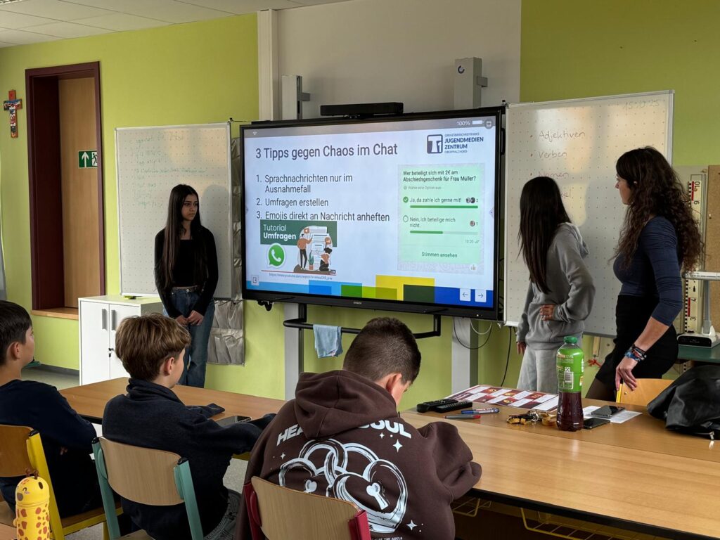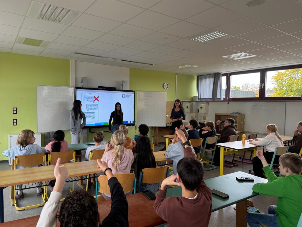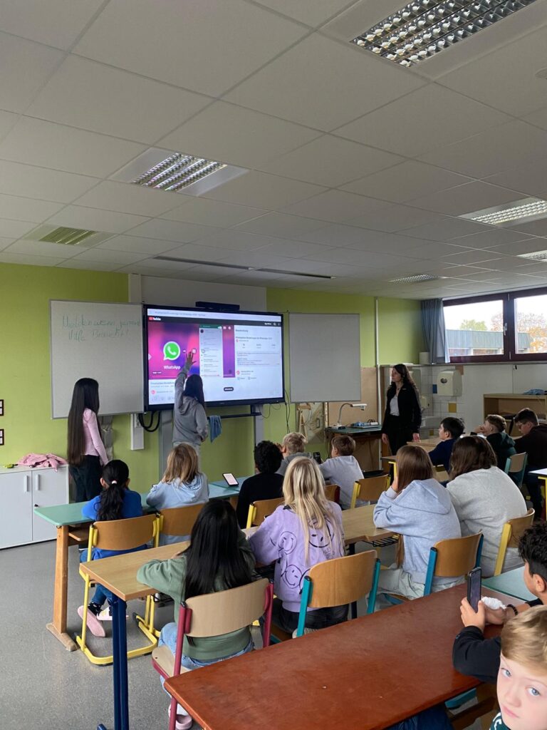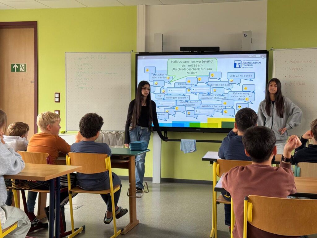 Ihren ersten Einsatz als Medientutoren hatten Selina und Noursan im Oktober in der 5. Jahrgangsstufe. Souverän gaben sie in drei Doppelstunden die in ihrer Ausbildung gelernten Informationen als Multiplikatoren an die Kinder weiter und betonten zum Schluss, dass die Fünftklässlerinnen und Fünftklässler gerne auf sie zukommen können, falls sie medienrelevante Fragen haben.