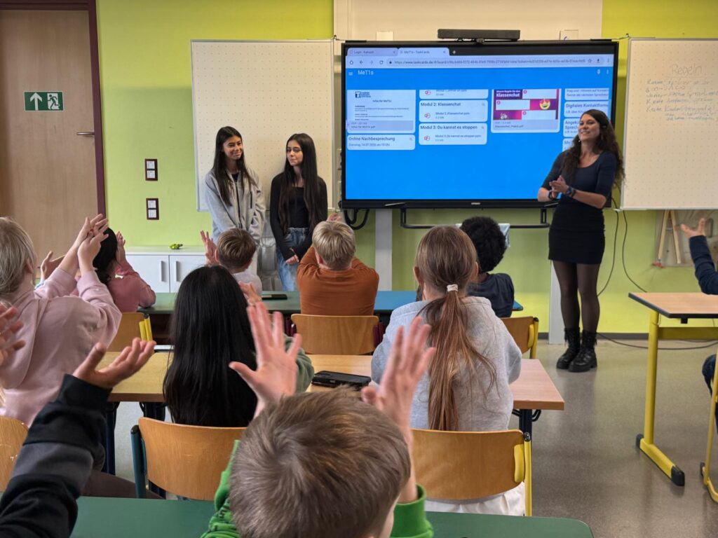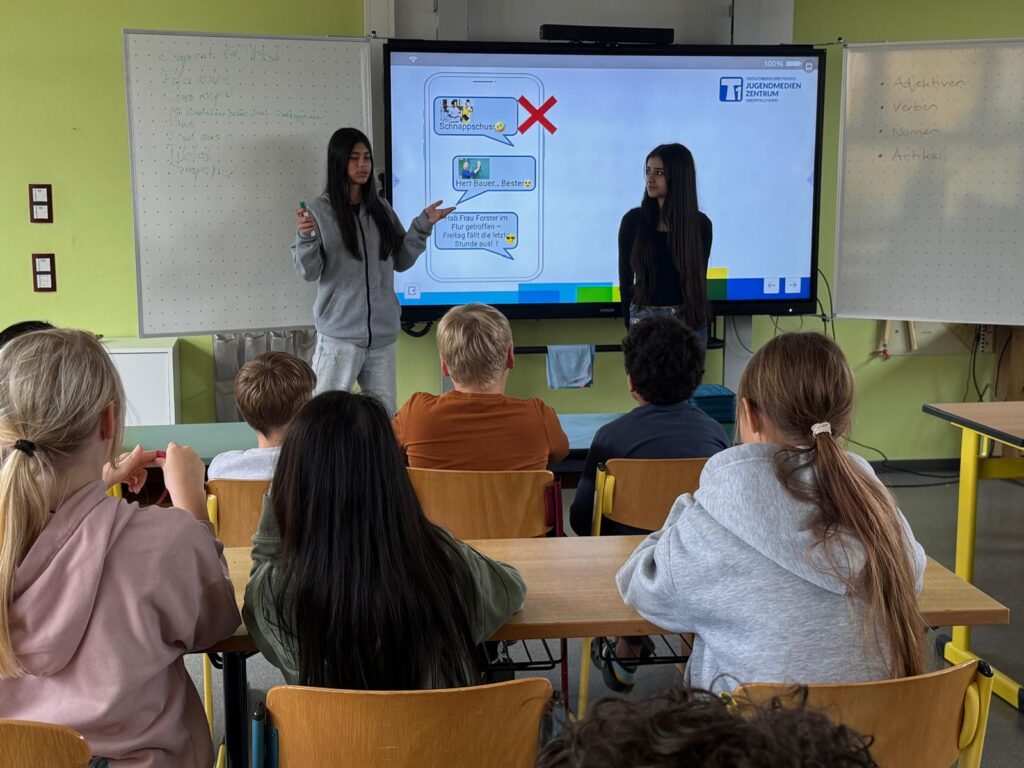 Selina und Noursan (8 GTK) sind die neuen Medientutoren (MeT1´s) an unserer Schule. Am Dienstag, 14.10.25, fand die Medientutoren-Ausbildung im Jugendmedienzentrum in Tannenlohe statt. Hier bekamen unsere Tutoren hilfreiche Übungen und Methoden an die Hand und wurden für die Module: „Always on – Medienkompetenz im Netz“, „Klassenchat-Regeln“ und „Cybermobbing-Prävention“ ausgebildet. Dabei wurden Handlungskompetenzen im Umgang mit eigenen Daten im Netz vermittelt sowie Verhaltensregeln in sozialen Netzwerken und Handlungsstrategien gegen Cybermobbing aufgezeigt, falls an der Schule Mitschüler davon betroffen sein sollten.
