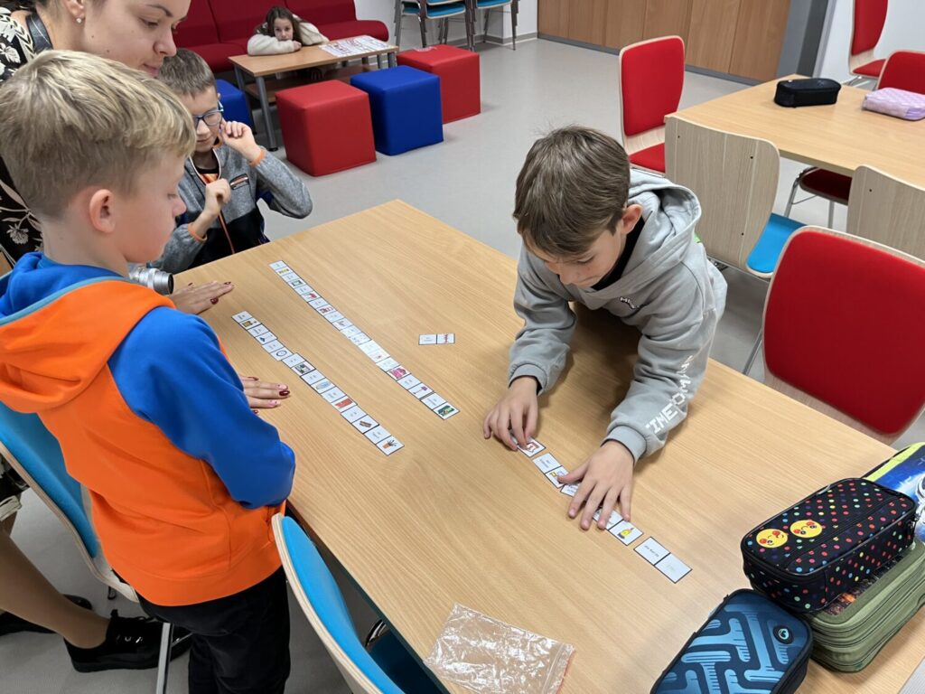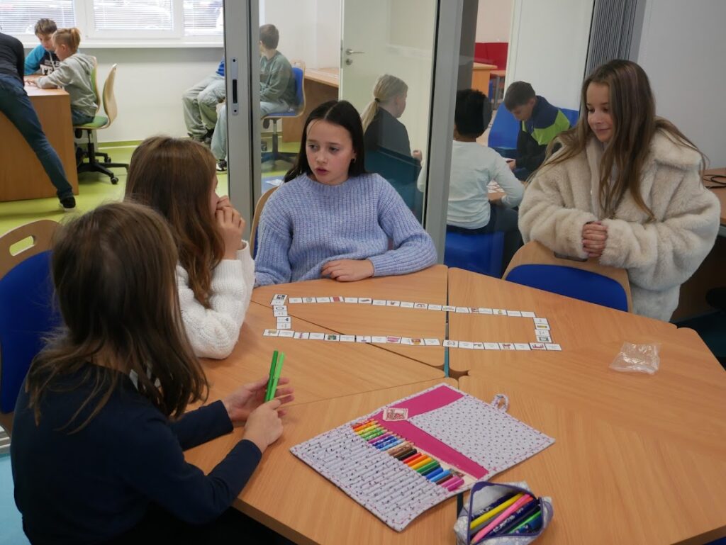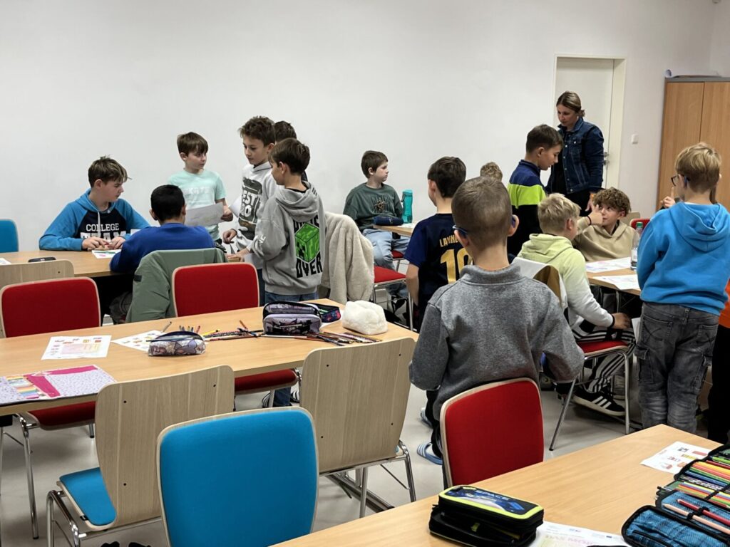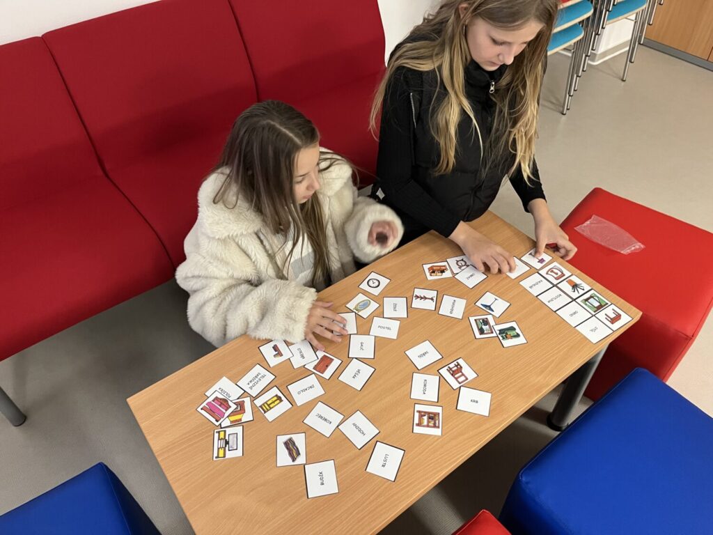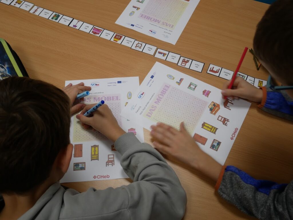 Für unsere Schülerinnen und Schüler aus der Tschechisch AG war der Besuch eine gute Gelegenheit, die erworbenen Sprachkenntnisse gleich praktisch anzuwenden. Gemeinsam mit der tschechischen Partnerklasse vertieften sie ihr aktuelles Unterrichtsthema: „Möbel und Zimmereinrichtung“ noch einmal intensiv. In gemischten deutsch-tschechischen Gruppen wiederholten die Kinder den Wortschatz mit Hilfe von Karten, Domino und Memory, lösten ein Buchstabenrätsel und gestalteten anschließend ein Themenbild – die deutschen Kinder nach einer tschechischen, die tschechischen Kinder nach einer deutschen Anleitung.