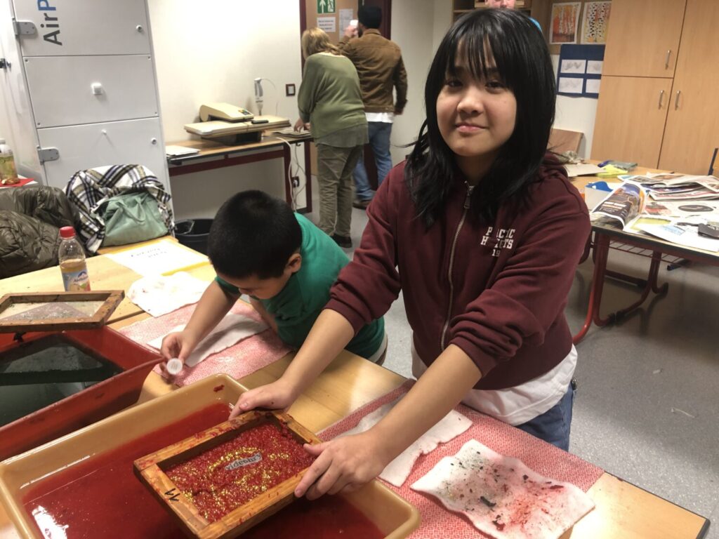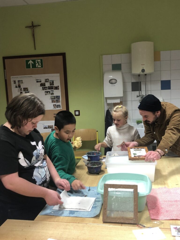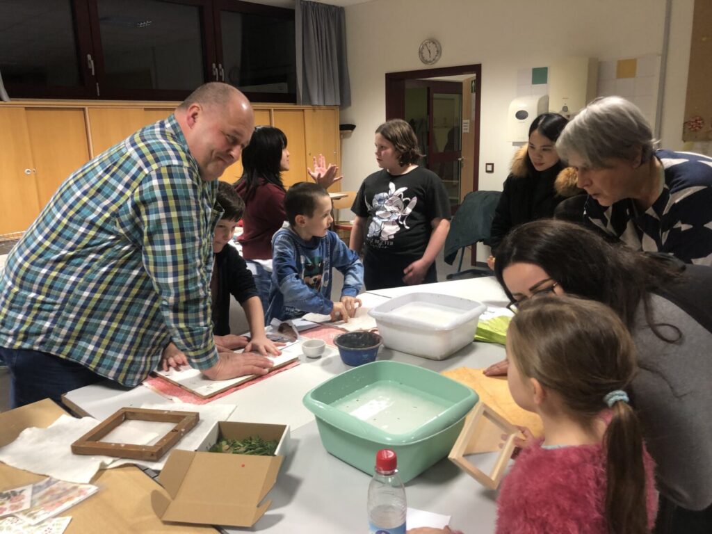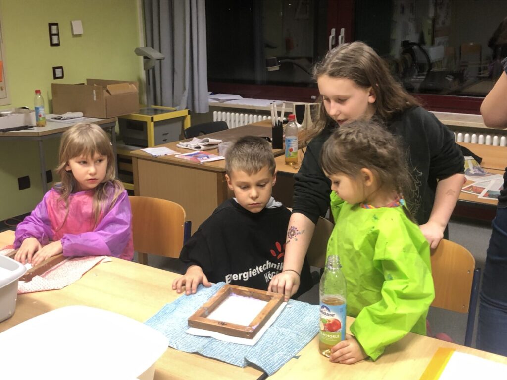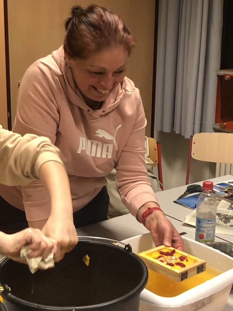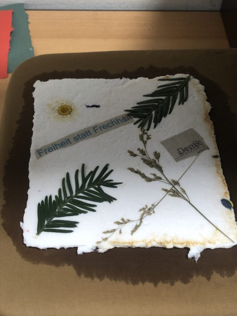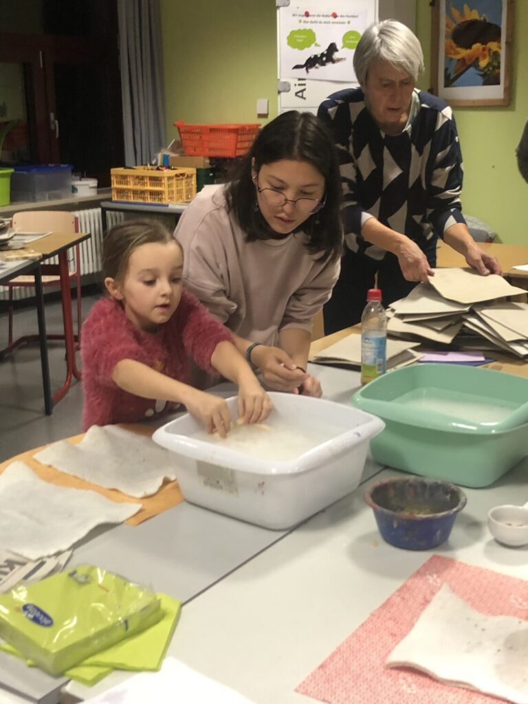 Beim Schöpfen von ganz individuellen Kunstpapieren erlebte die interkulturelle Gruppe, wie sich einzelne kleine Fasern neu zu einem spannenden Ganzen verbinden – und damit sinnbildlich auch ein gemeinsames Zeichen von Zusammenhalt. Mit der Kunstschule entdeckten die Kinder mit ihren Eltern viele Möglichkeiten, das Papiergautschen kreativ zu begleiten. Verschiedene pflanzliche Rohstoffe, aber auch eigene Experimente mit Stoffen aus der Natur und sogar der Küche, standen dabei zur Verfügung und wurden eifrig genutzt. Zeitungen aus beiden Ländern fanden Verwendung, um bilinguale Botschaften in die Papierobjekte einzubauen und poetische Collagen zu gestalten.