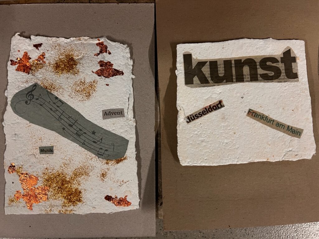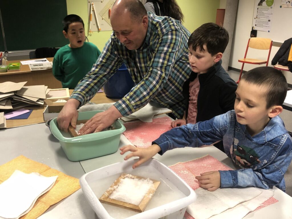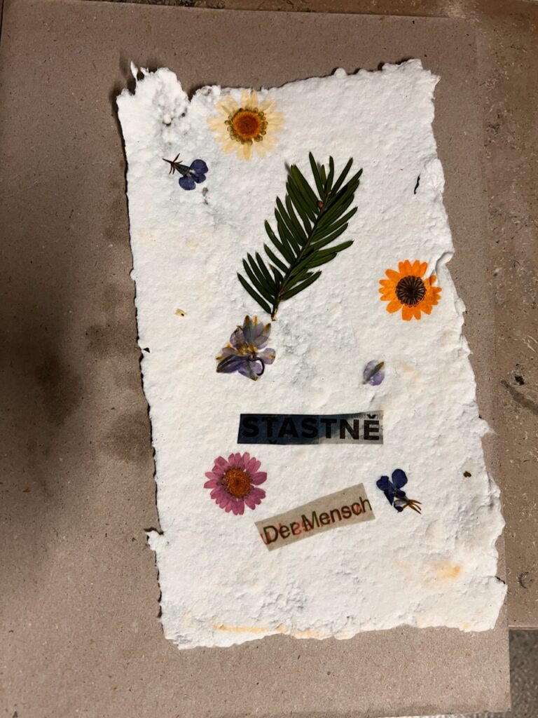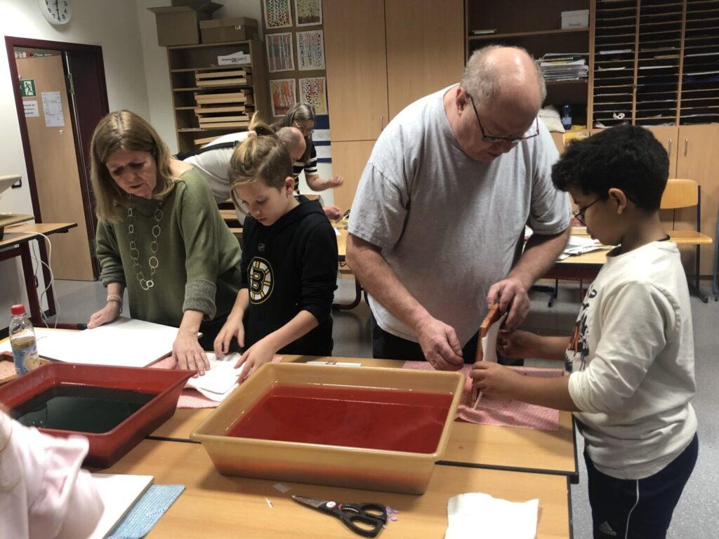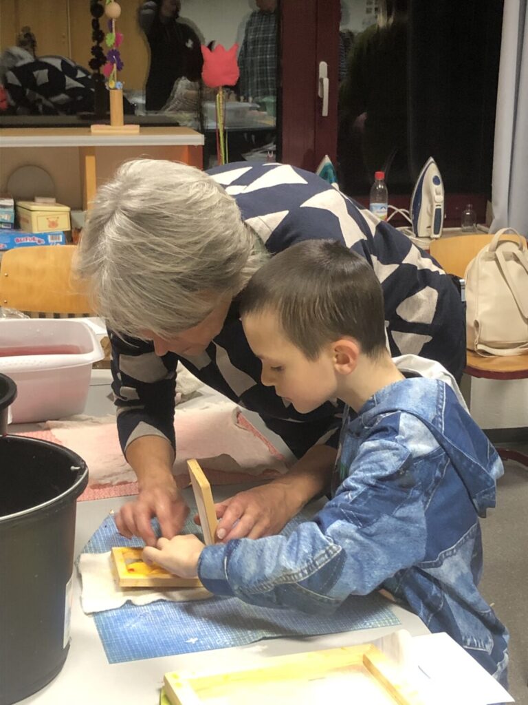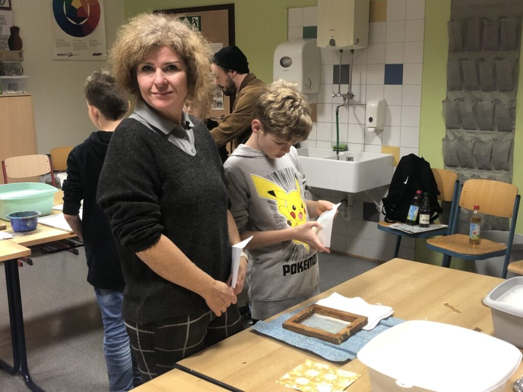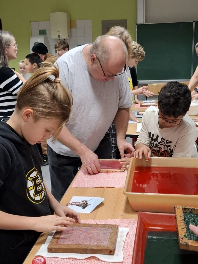 Beim Schöpfen von ganz individuellen Kunstpapieren erlebte die interkulturelle Gruppe, wie sich einzelne kleine Fasern neu zu einem spannenden Ganzen verbinden – und damit sinnbildlich auch ein gemeinsames Zeichen von Zusammenhalt. Mit der Kunstschule entdeckten die Kinder mit ihren Eltern viele Möglichkeiten, das Papiergautschen kreativ zu begleiten. Verschiedene pflanzliche Rohstoffe, aber auch eigene Experimente mit Stoffen aus der Natur und sogar der Küche, standen dabei zur Verfügung und wurden eifrig genutzt. Zeitungen aus beiden Ländern fanden Verwendung, um bilinguale Botschaften in die Papierobjekte einzubauen und poetische Collagen zu gestalten.