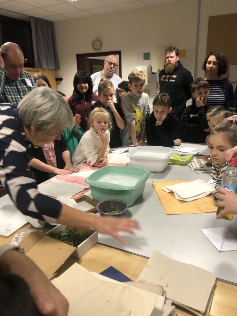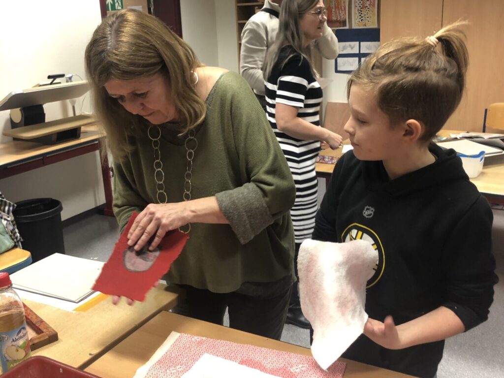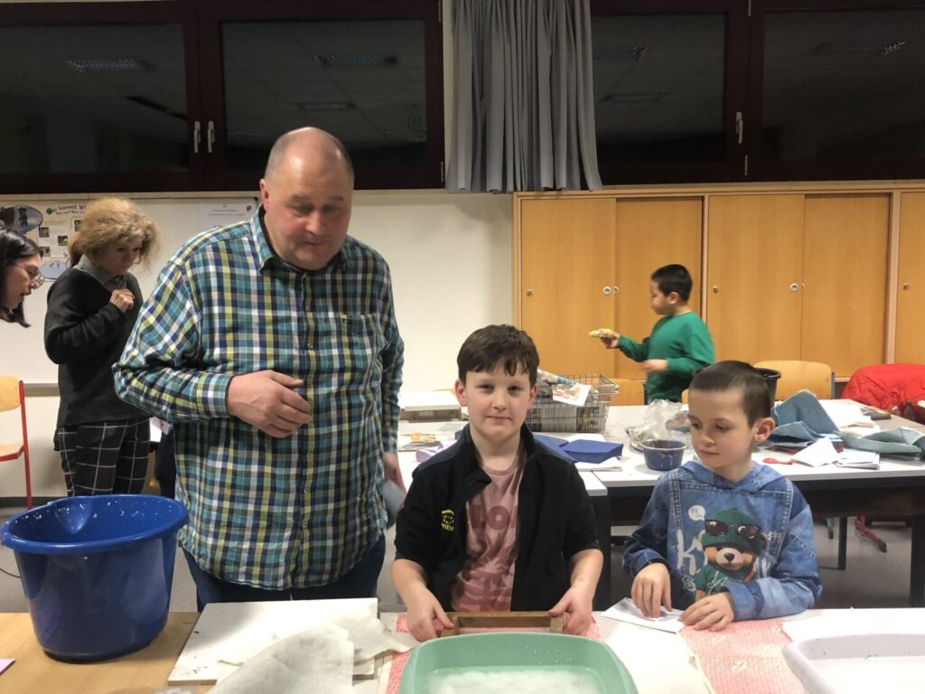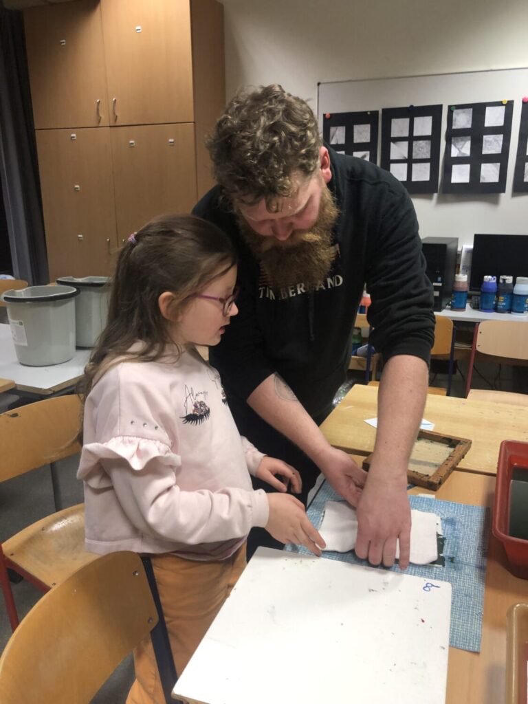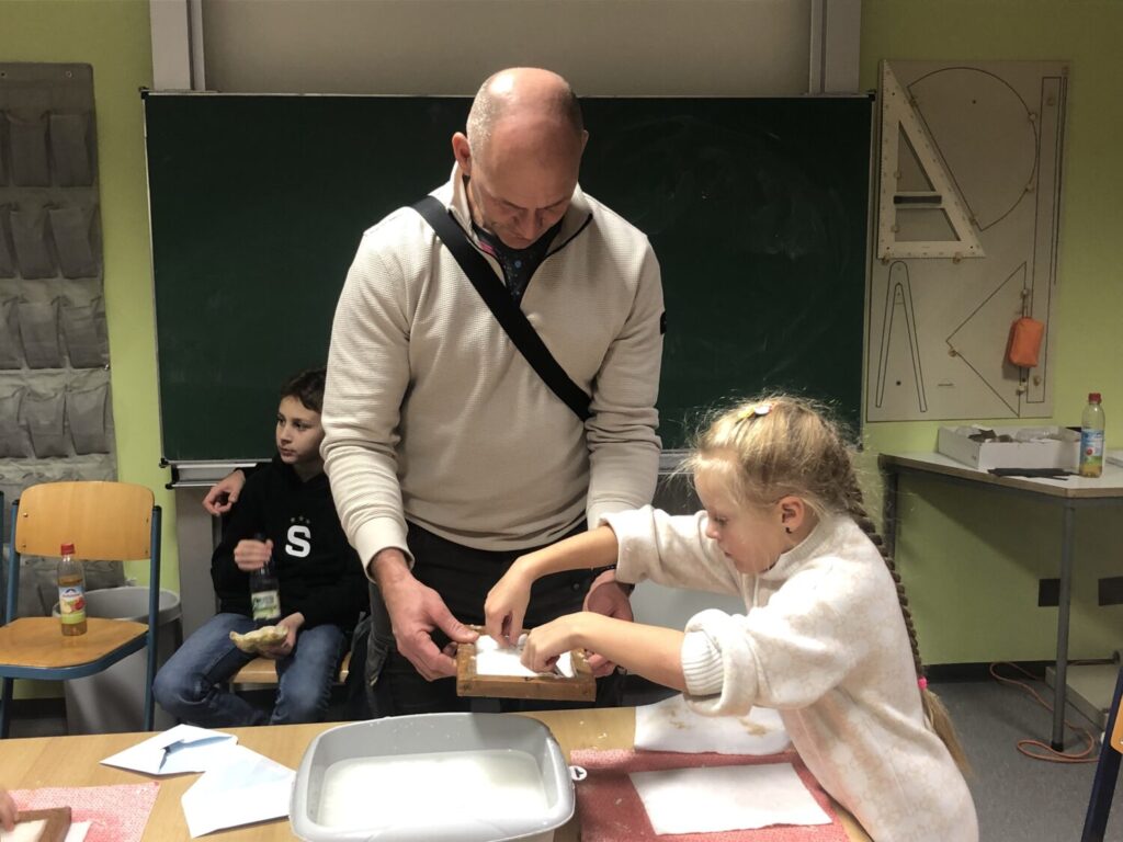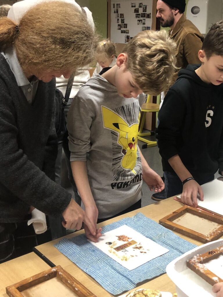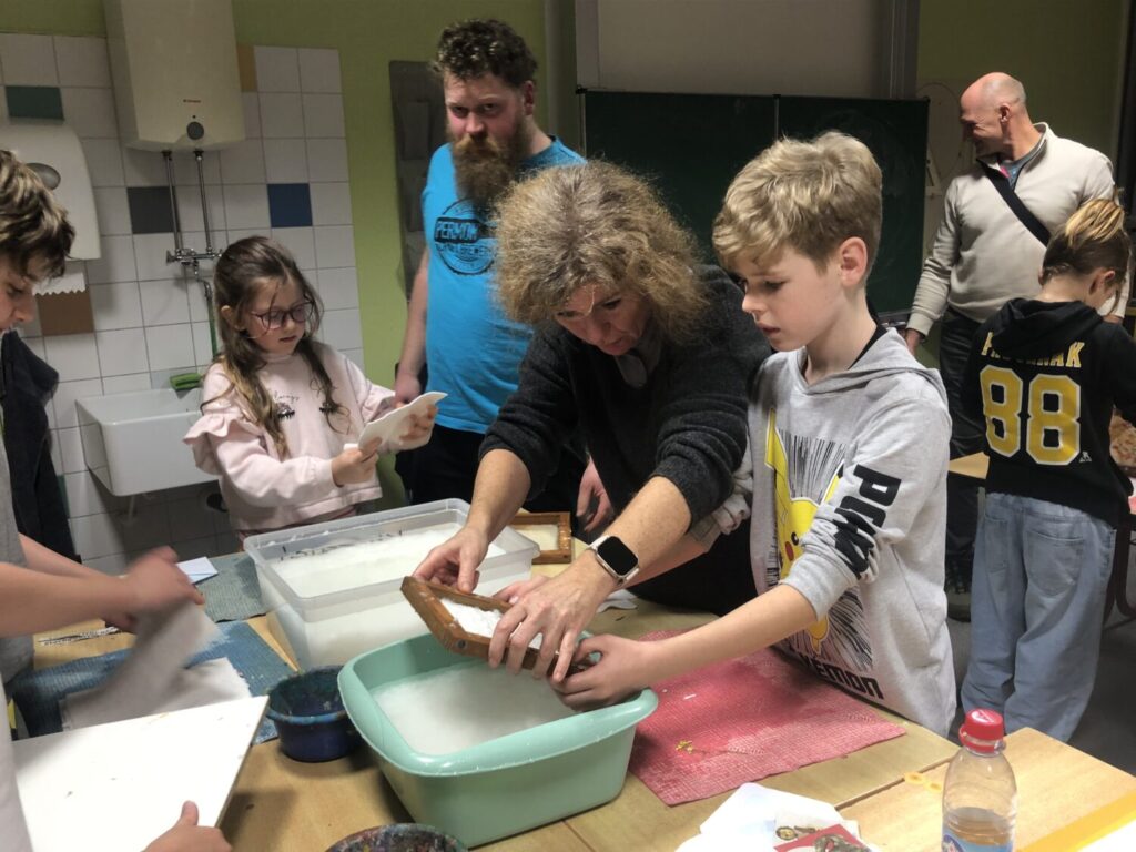 Beim Schöpfen von ganz individuellen Kunstpapieren erlebte die interkulturelle Gruppe, wie sich einzelne kleine Fasern neu zu einem spannenden Ganzen verbinden – und damit sinnbildlich auch ein gemeinsames Zeichen von Zusammenhalt. Mit der Kunstschule entdeckten die Kinder mit ihren Eltern viele Möglichkeiten, das Papiergautschen kreativ zu begleiten. Verschiedene pflanzliche Rohstoffe, aber auch eigene Experimente mit Stoffen aus der Natur und sogar der Küche, standen dabei zur Verfügung und wurden eifrig genutzt. Zeitungen aus beiden Ländern fanden Verwendung, um bilinguale Botschaften in die Papierobjekte einzubauen und poetische Collagen zu gestalten.