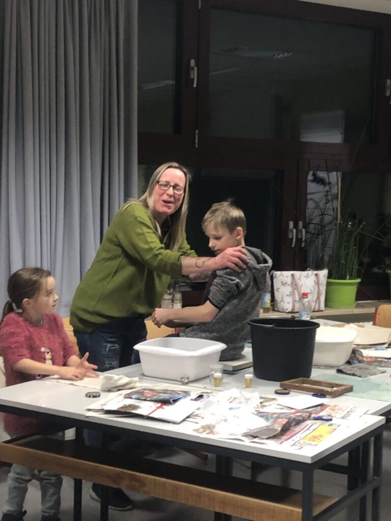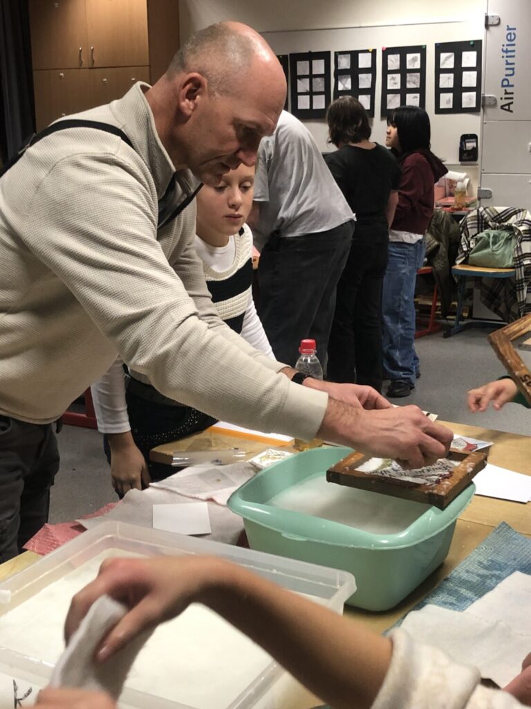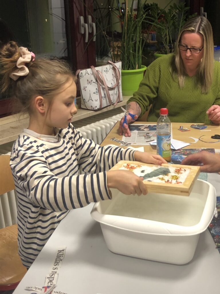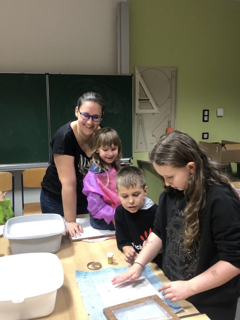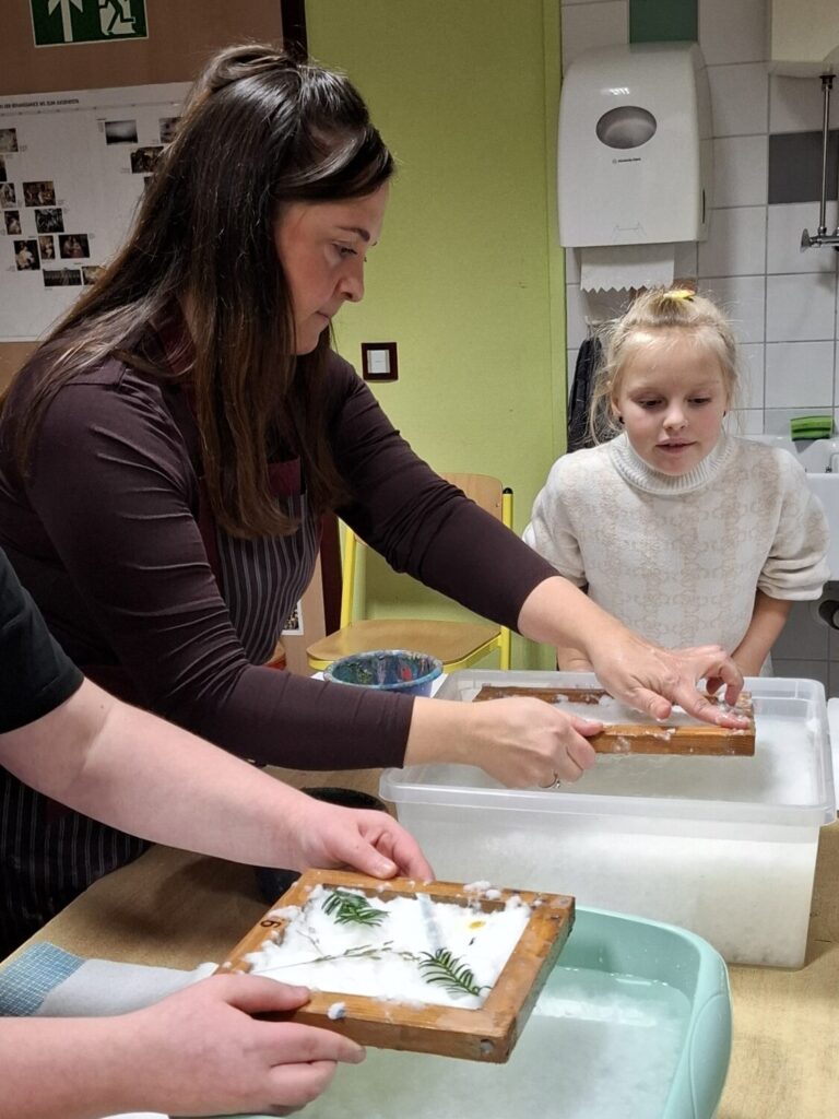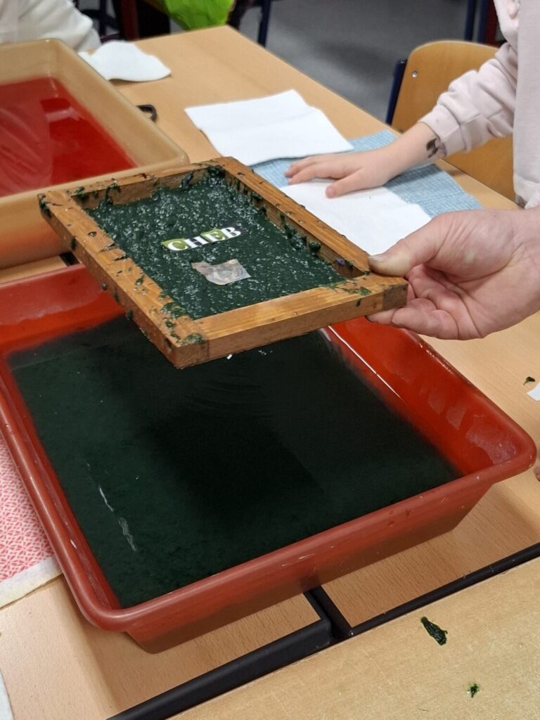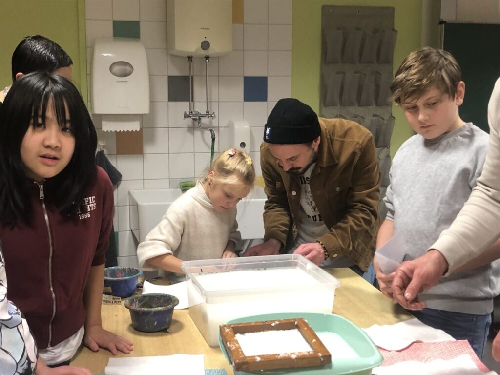Beim Schöpfen von ganz individuellen Kunstpapieren erlebte die interkulturelle Gruppe, wie sich einzelne kleine Fasern neu zu einem spannenden Ganzen verbinden – und damit sinnbildlich auch ein gemeinsames Zeichen von Zusammenhalt. Mit der Kunstschule entdeckten die Kinder mit ihren Eltern viele Möglichkeiten, das Papiergautschen kreativ zu begleiten. Verschiedene pflanzliche Rohstoffe, aber auch eigene Experimente mit Stoffen aus der Natur und sogar der Küche, standen dabei zur Verfügung und wurden eifrig genutzt. Zeitungen aus beiden Ländern fanden Verwendung, um bilinguale Botschaften in die Papierobjekte einzubauen und poetische Collagen zu gestalten.