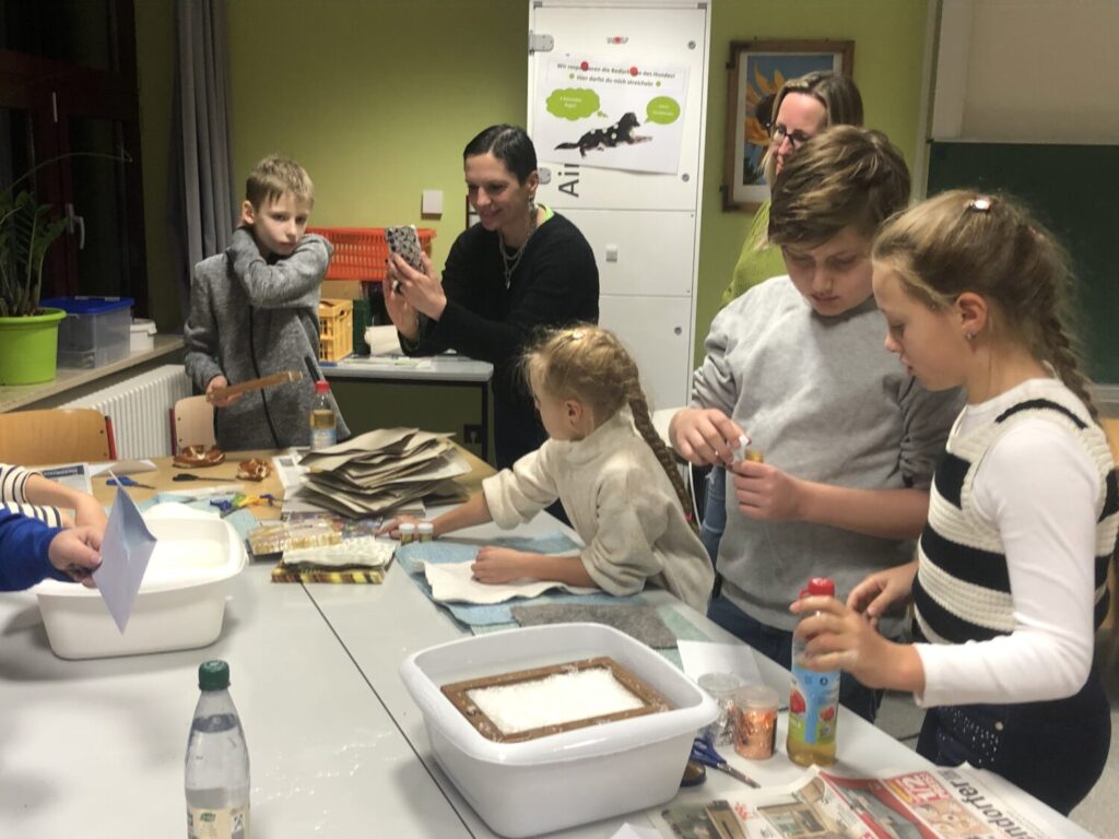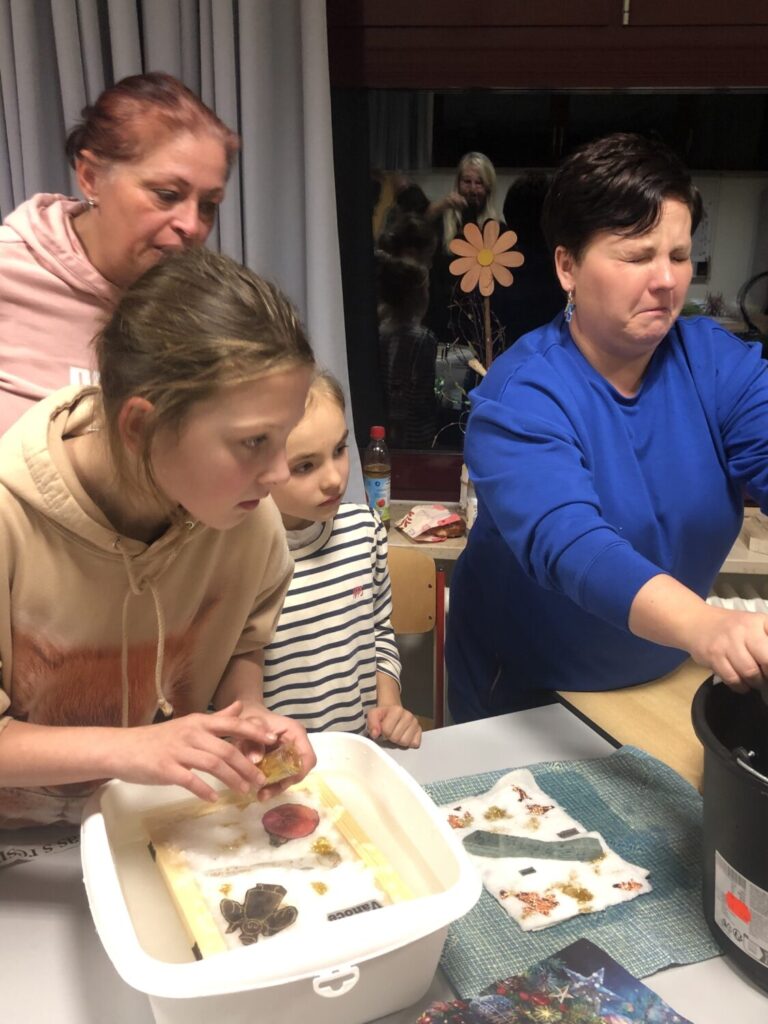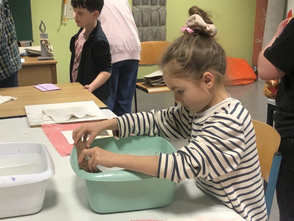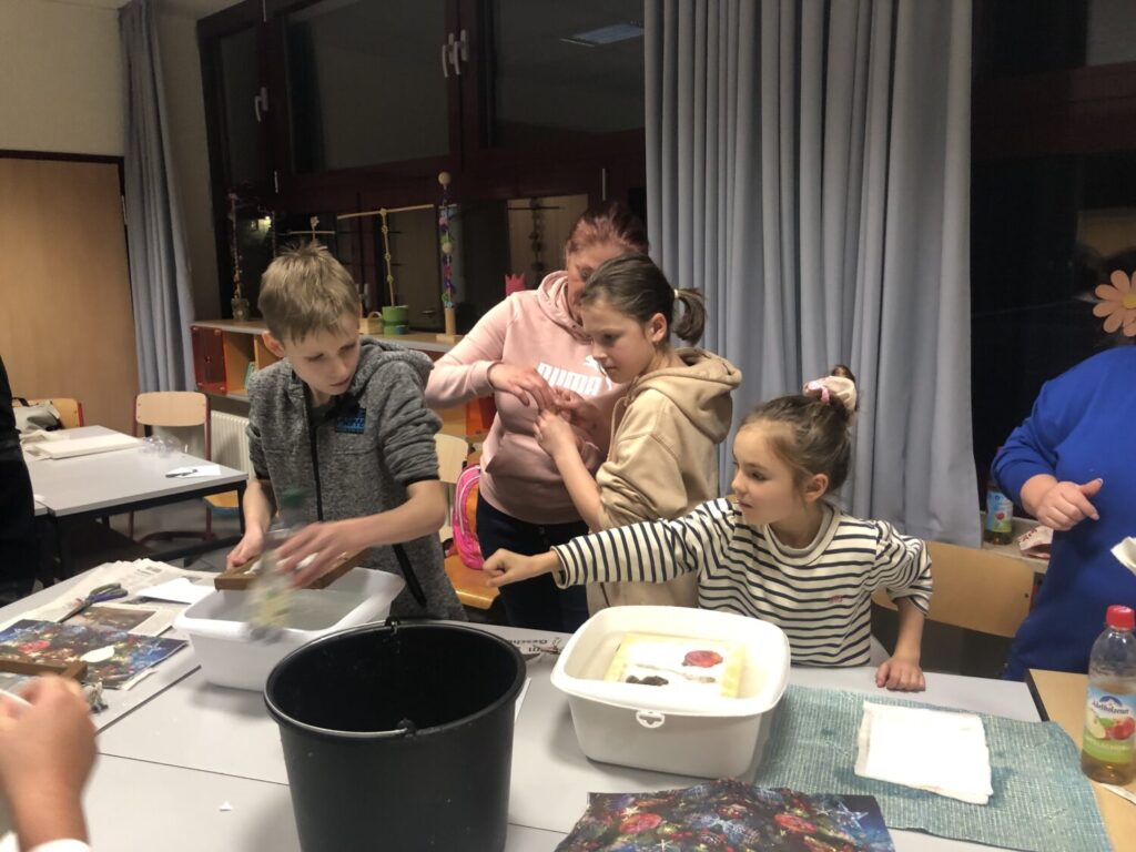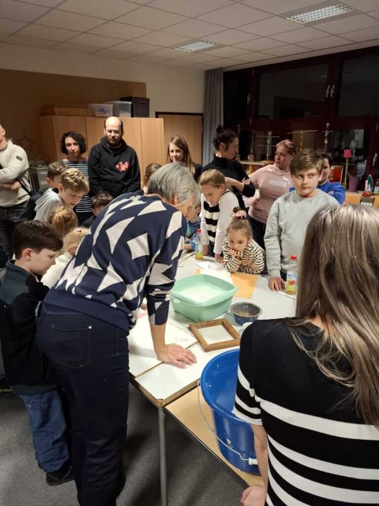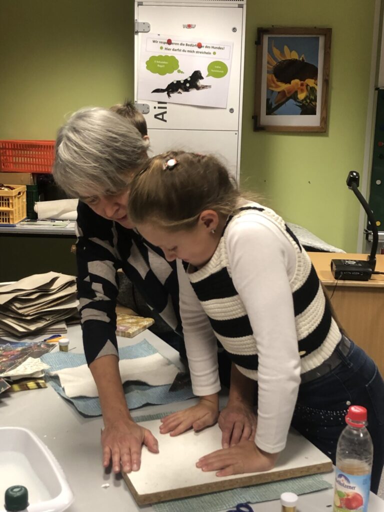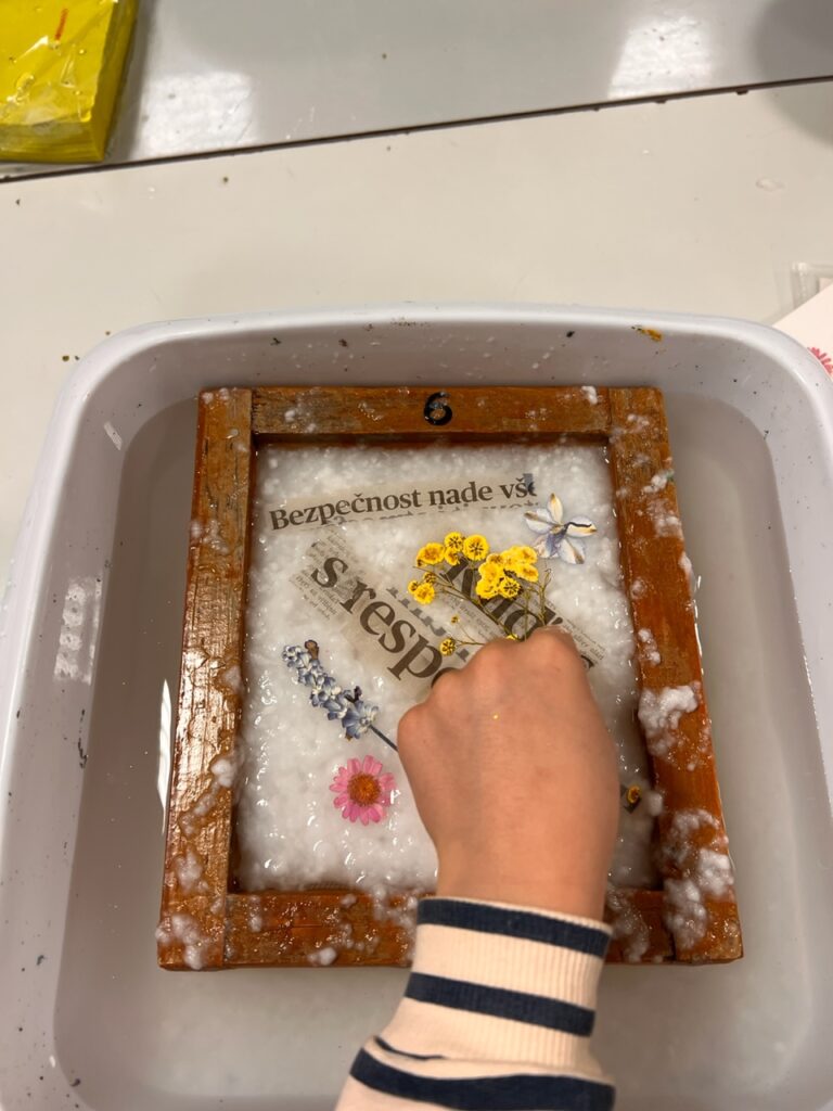 Beim Schöpfen von ganz individuellen Kunstpapieren erlebte die interkulturelle Gruppe, wie sich einzelne kleine Fasern neu zu einem spannenden Ganzen verbinden – und damit sinnbildlich auch ein gemeinsames Zeichen von Zusammenhalt. Mit der Kunstschule entdeckten die Kinder mit ihren Eltern viele Möglichkeiten, das Papiergautschen kreativ zu begleiten. Verschiedene pflanzliche Rohstoffe, aber auch eigene Experimente mit Stoffen aus der Natur und sogar der Küche, standen dabei zur Verfügung und wurden eifrig genutzt. Zeitungen aus beiden Ländern fanden Verwendung, um bilinguale Botschaften in die Papierobjekte einzubauen und poetische Collagen zu gestalten.