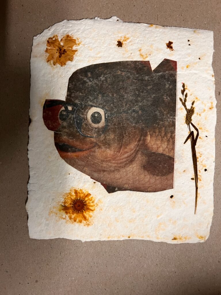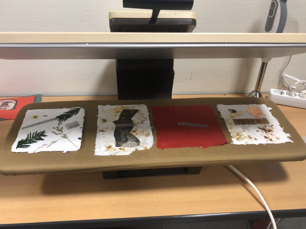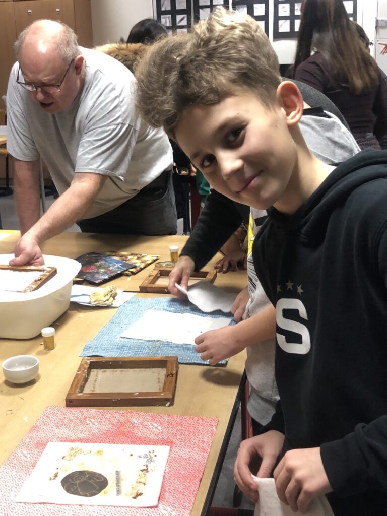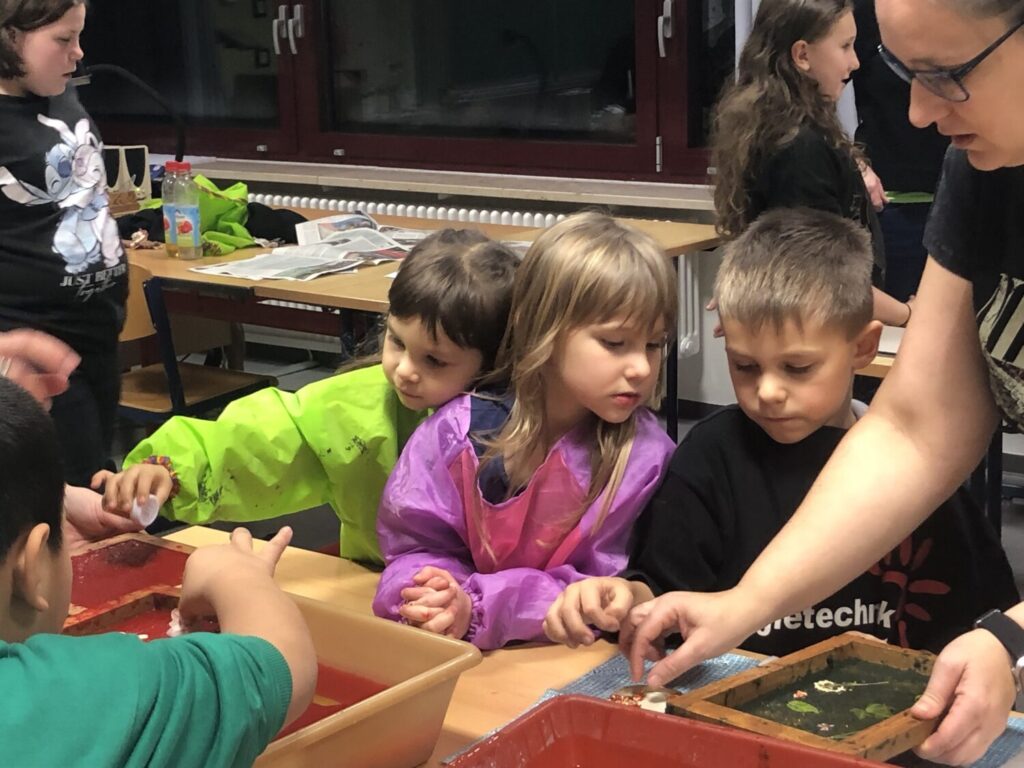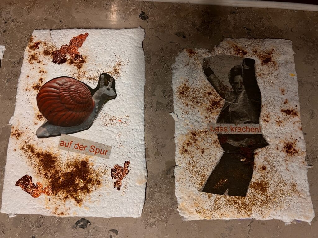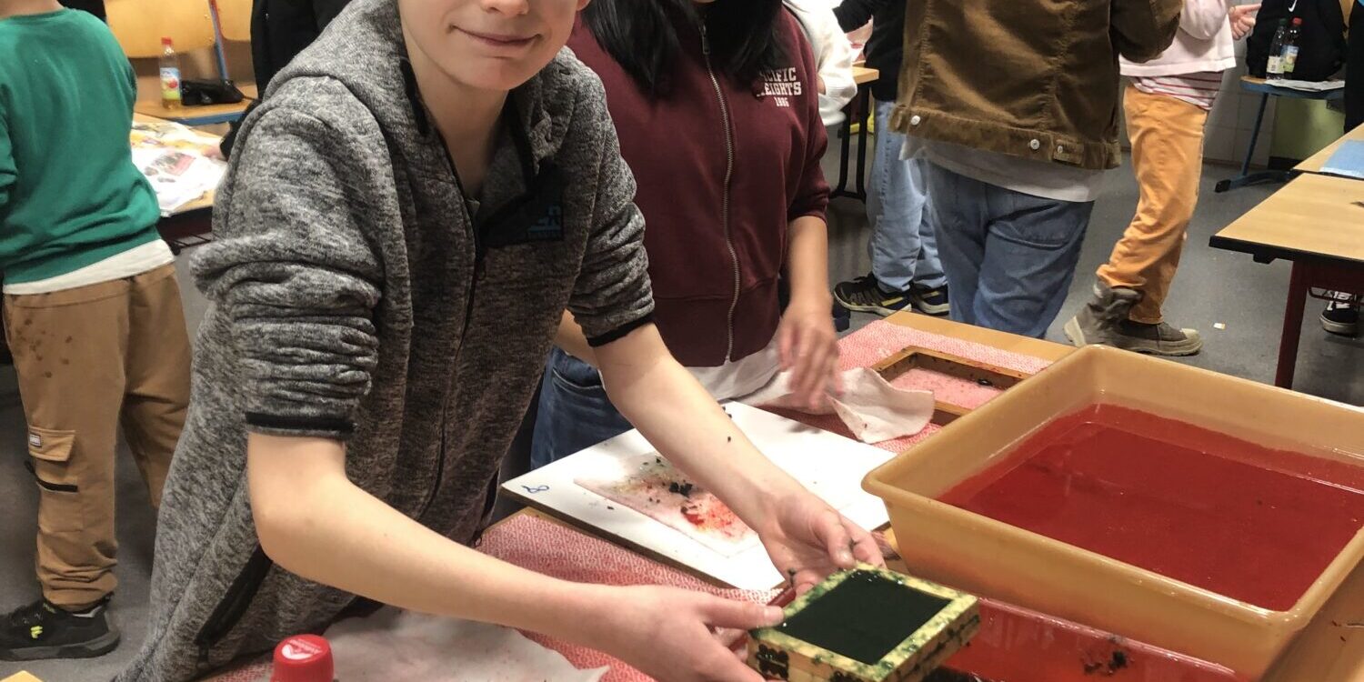 Beim Schöpfen von ganz individuellen Kunstpapieren erlebte die interkulturelle Gruppe, wie sich einzelne kleine Fasern neu zu einem spannenden Ganzen verbinden – und damit sinnbildlich auch ein gemeinsames Zeichen von Zusammenhalt. Mit der Kunstschule entdeckten die Kinder mit ihren Eltern viele Möglichkeiten, das Papiergautschen kreativ zu begleiten. Verschiedene pflanzliche Rohstoffe, aber auch eigene Experimente mit Stoffen aus der Natur und sogar der Küche, standen dabei zur Verfügung und wurden eifrig genutzt. Zeitungen aus beiden Ländern fanden Verwendung, um bilinguale Botschaften in die Papierobjekte einzubauen und poetische Collagen zu gestalten.