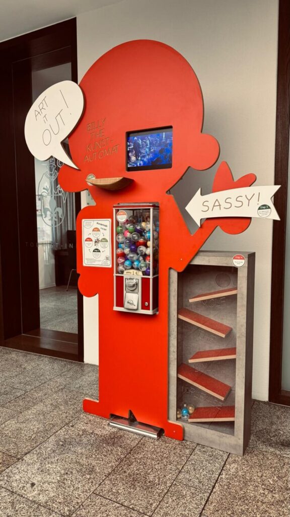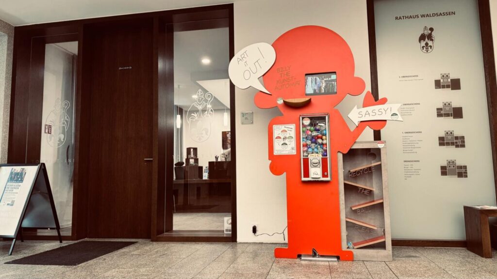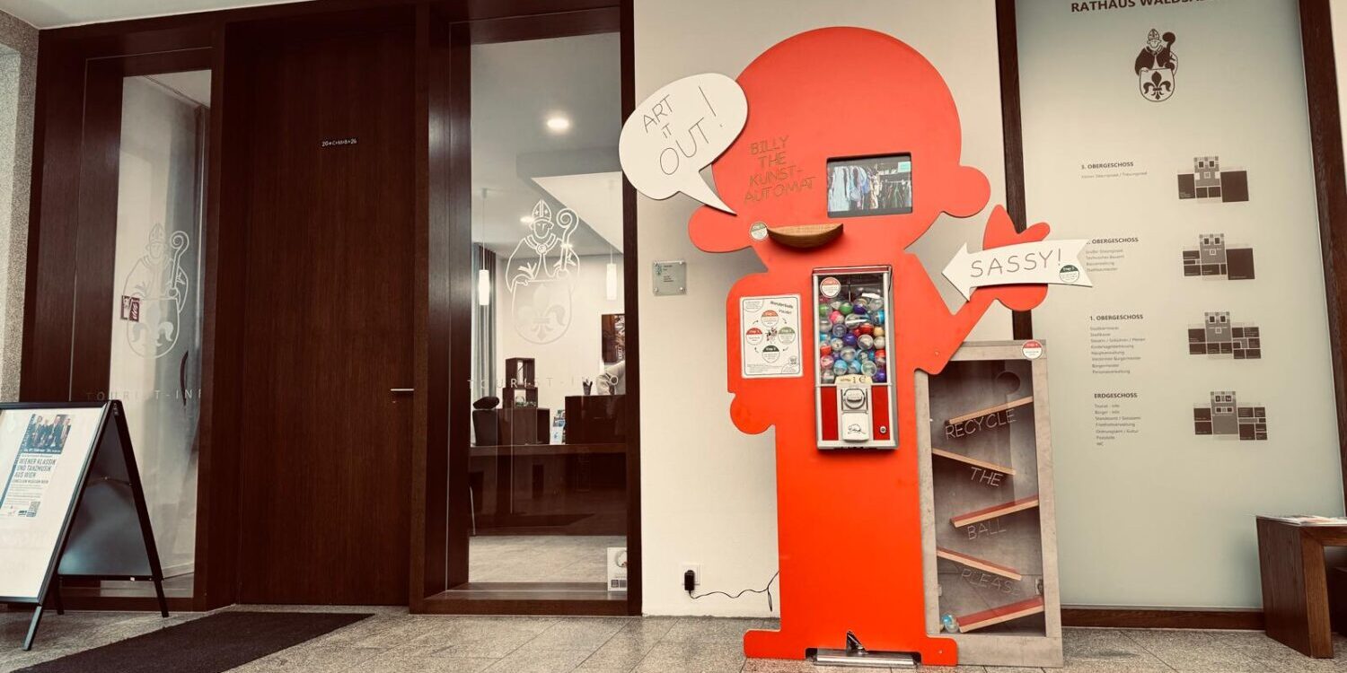 „Billy the Kunstautomat“ ist vorübergehend im Rathaus Waldsassen eingezogen und erfreut dort die Besucher mit individuellen und handgefertigten kleinen Kunstwerken von Schülerinnen und Schülern der Klassen 5-9, regional und international bekannten Künstlern, Kunstlehrern und Fachlehrer-Studierenden. Bereits beim Aufstellen zog Billy viele Blicke auf sich, Passanten blieben vor unserer Bildschirmdemo stehen, stellten Fragen und fanden unseren Billy einfach großartig. Einige Eltern werden nochmal mit ihren Kindern im Rathaus vorbeischauen und Billy besuchen. Wir hoffen sehr, dass er allen Rathausbesuchern ein Lächeln ins Gesicht zaubert und ihnen mit unseren kleinen Kunstwerken Freude bereitet.