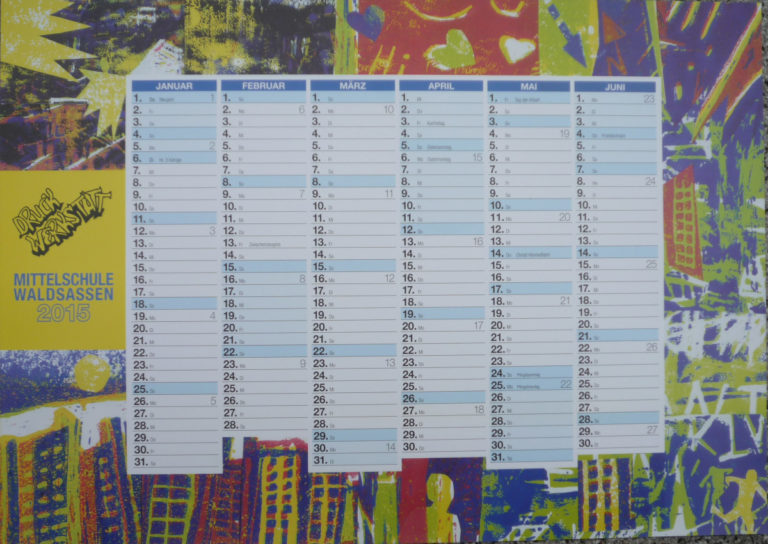 „Druckwerkstatt“ lautet das Motto unseres neuen Schulkalenders. Zusammen mit Schülerinnen und Schülern der 8GTK hat Fachoberlehrerin Helga Küchler aus Linoldrucken der Klasse den neuen Kalender gestaltet.